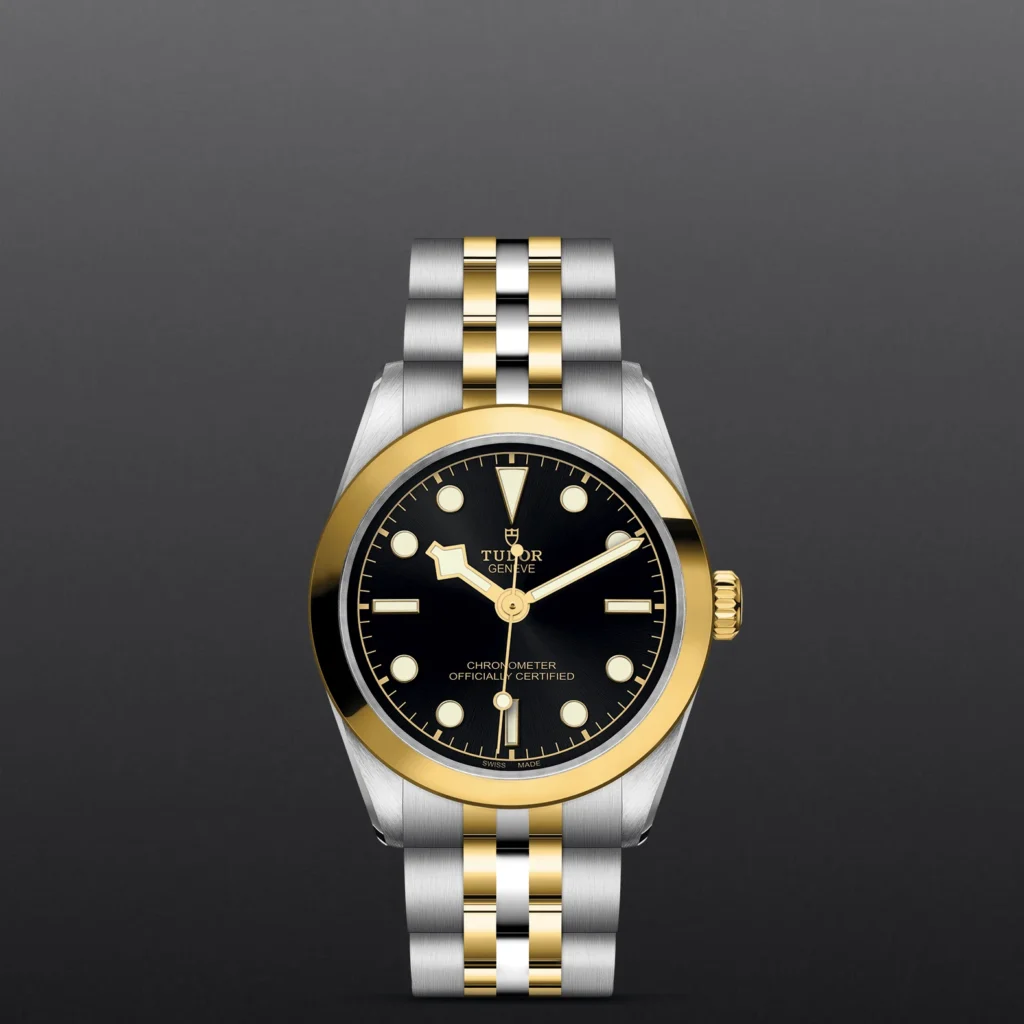 Bracelet First center links in steel or solid yellow gold. Remaining center links are made of a steel core capped with 0.2mm of yellow gold. TUDOR "T-fit" folding clasp with safety catch. The logo on the catc, First center links in steel or solid yellow gold. Remaining centre links are made of a steel core capped with 0.2mm of yellow gold. TUDOR "T-fit" folding clasp with safety catch. The logo on the catc
