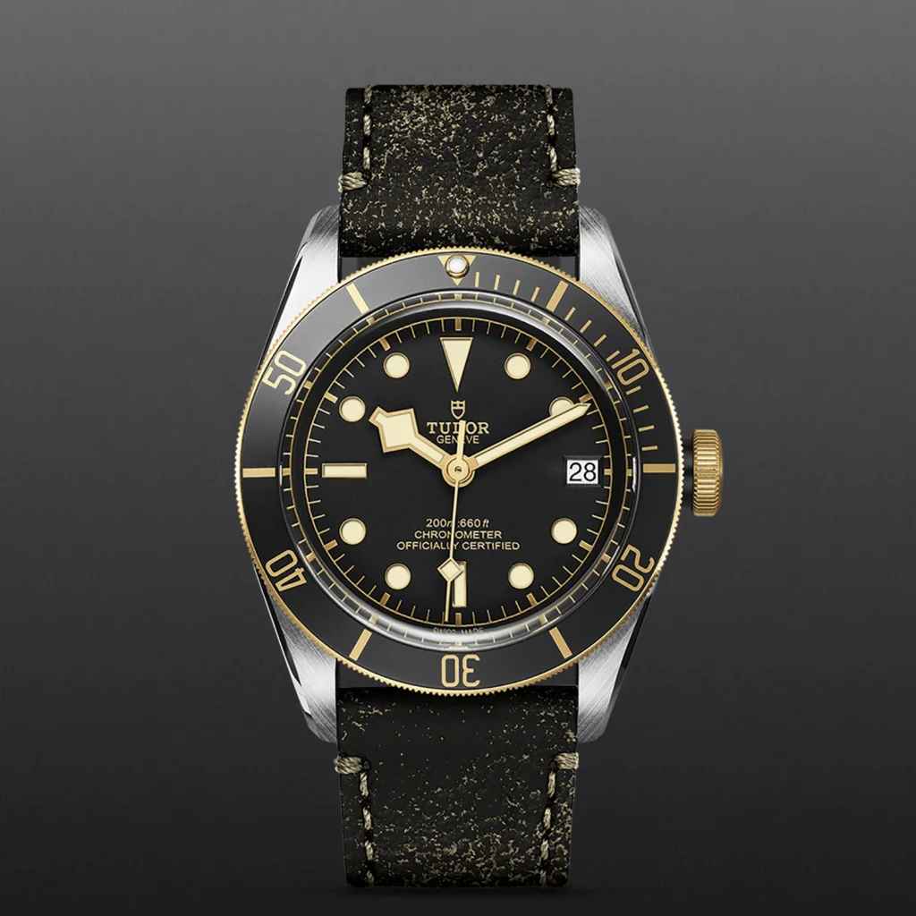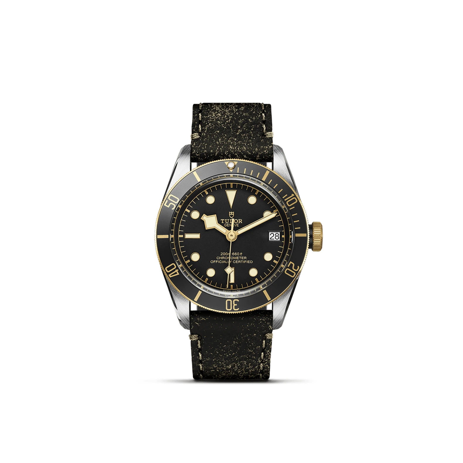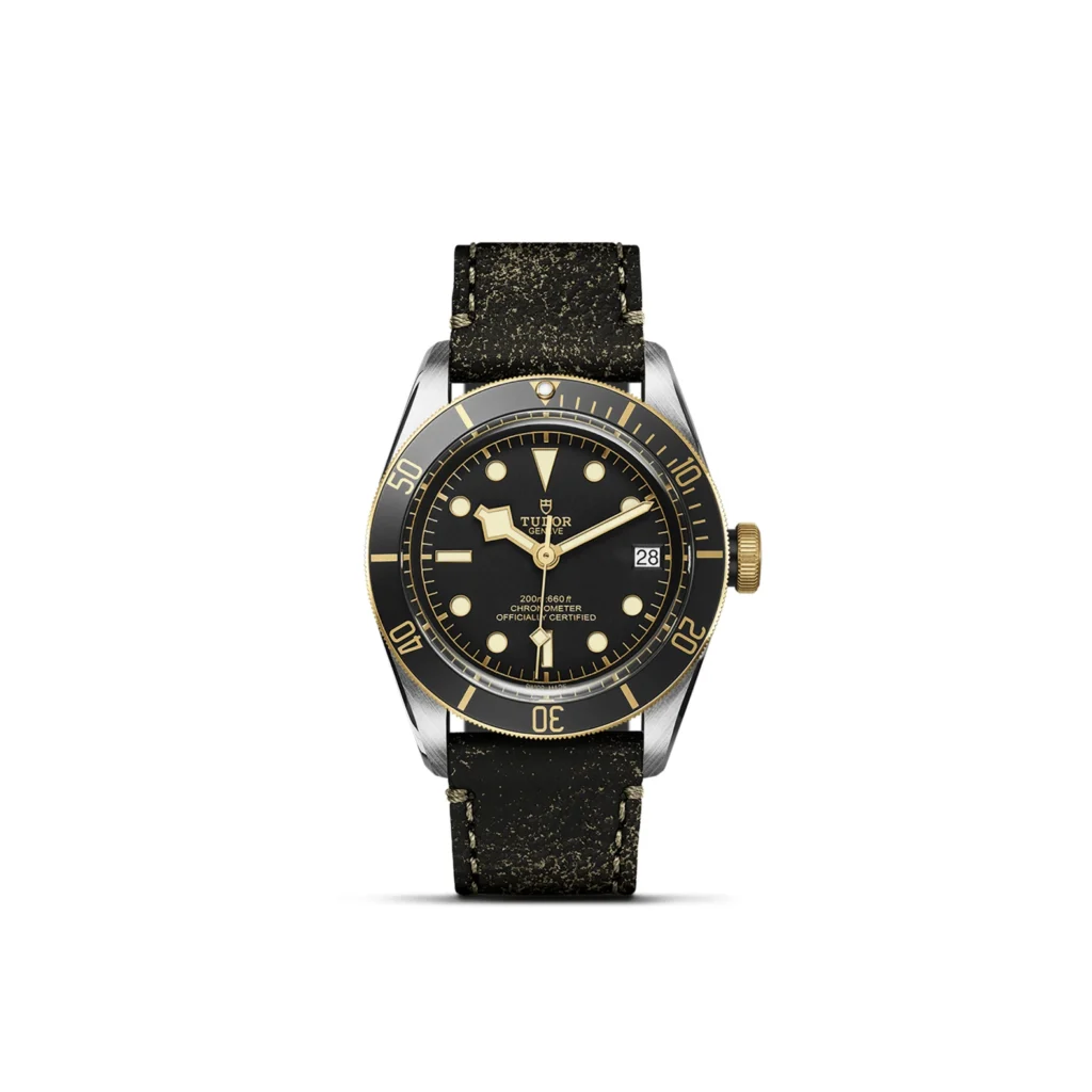 Corona di carica Corona di carica a vite con incisa la rosa TUDOR laccata nera e con tubo della corona in alluminio anodizzato nero. Acciaio rivestito da uno strato di oro giallo di 0,3 mm