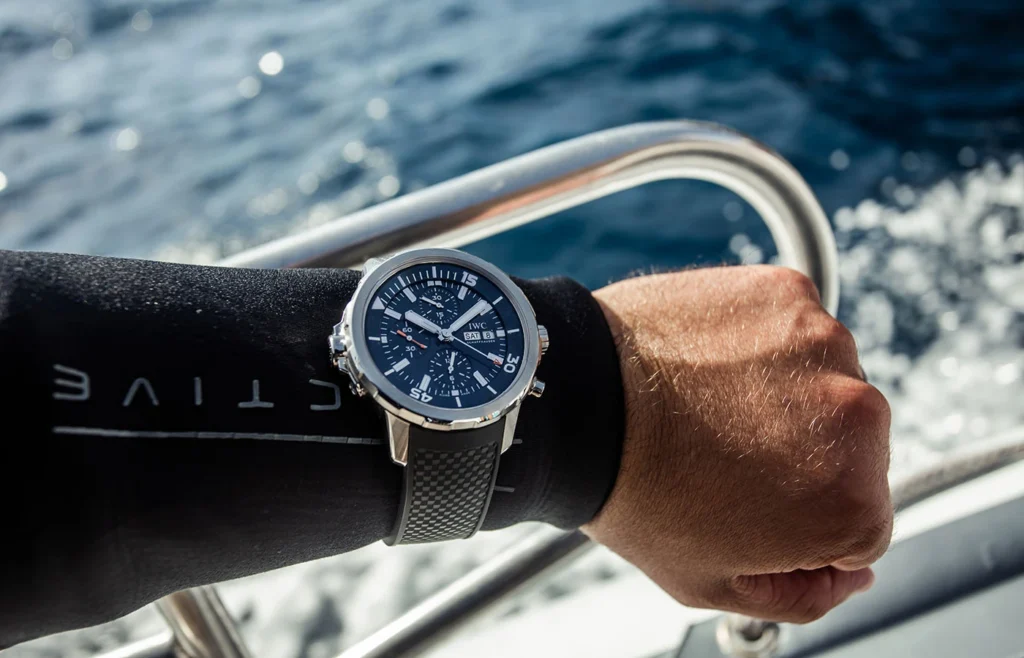 IWC Schaffhausen ha alle spalle oltre 50 anni di esperienza nello sviluppo e nella produzione di orologi subacquei professionali. La nuova collezione Aquatimer ha un sistema di sostituzione rapida del cinturino (un brevetto IWC) che permette di passare facilmente dal bracciale in acciaio in caucciù.